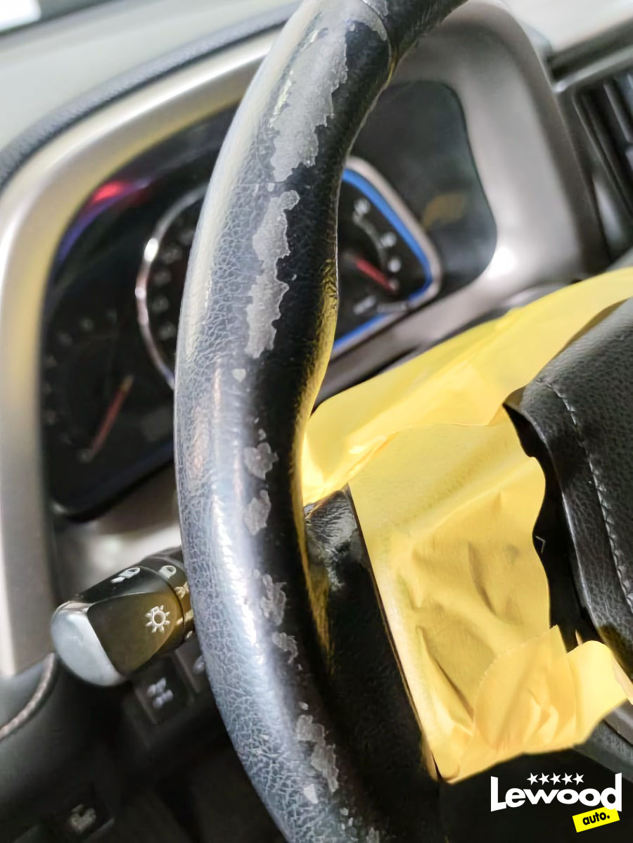 Потертый руль авто лидирует в пятерке самых частых повреждений в салоне автомобиля. Кто-то приезжает на реставрацию, когда на кожаном руле просто появился жирный блеск, кто-то терпит до подстертого слоя краски. Но иногда руль выглядит так, как будто его специально пытались протереть до дыр. Краска облезает «до мяса», и наружу вылезает голая кожа. В некоторых случаях такой руль проще перетянуть, чем отреставрировать. Но для мастеров Lewood нет ничего невозможного, и даже очень сложную ситуацию можно разрулить при помощи мастерства, профессиональных хитростей и краски.