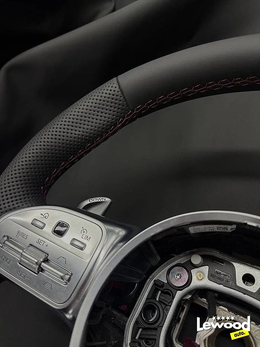 Владельцу авто нравился оригинальный дизайн руля из черной кожи с красными вставками и красной строчкой. Но ему хотелось перешить руль в другой на ощупь материал и немного увеличить его объем. Мы взялись за задачу. Подобрали кожу, которая будет нравиться клиенту внешне и на ощупь. Демонтировали руль, аккуратно отключили всю электронику и рулевую подушку безопасности. «Раздели» руль и по форме родных элементов выкроили новые, немного изменив пропорции. Соединили все элементы в новую обшивку для руля, «одели» руль, воссоздали контрастную красную строчку. Получился обновленный руль с сохранением оригинального дизайна.