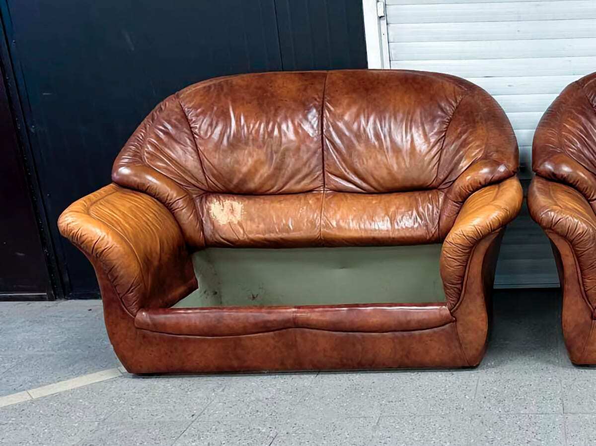 Мы решили работать по всем фронтам. Отчистили пятна со всех сторон: на спинках, подлокотниках, сбоку и сзади. Локально заделали мелкие повреждения: дырки, царапины, задиры. Восстановили «убитые» канты. Спинки, где дыра была размером почти с саму спинку, восстановить методами реставрации невозможно. Поэтому самые пострадавшие элементы спинок обоих диванов мы перешили в новую кожу. После этого взялись за окрашивание. Особенно тщательно красили подлокотники, чтобы вернуть им первоначальный цвет. В остальном обошлись локальным окрашиванием. Дали диванам высохнуть и оценили результат — они помолодели и похорошели.